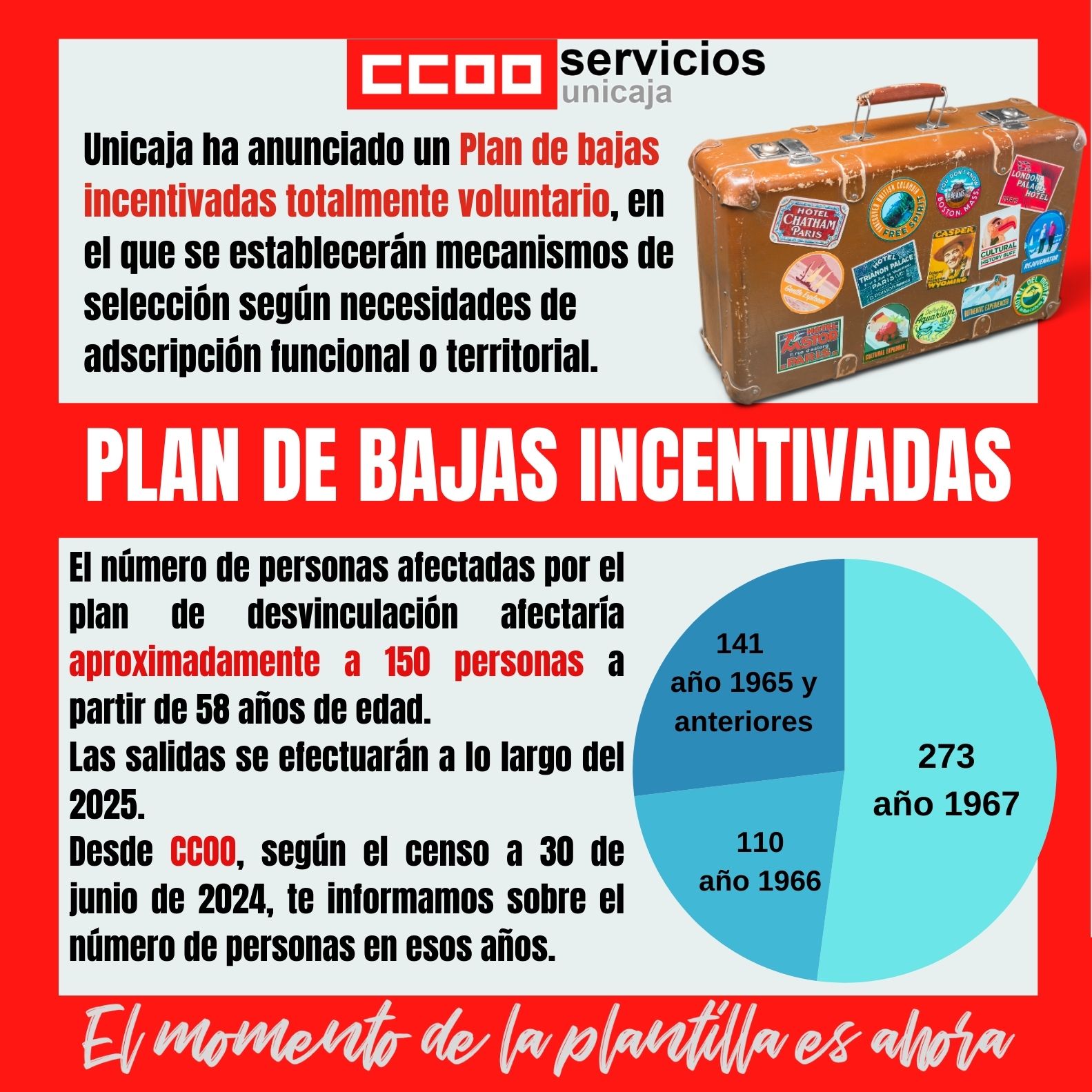 El número de personas afectadas por el plan de desvinculación afectaría aproximadamente a 150 personas a partir de 58 años de edad. Las salidas se efectuarán a lo largo del 2025. Desde CCOO, según el censo a 30 de junio de 2024, te informamos sobre el número de personas en esos años.