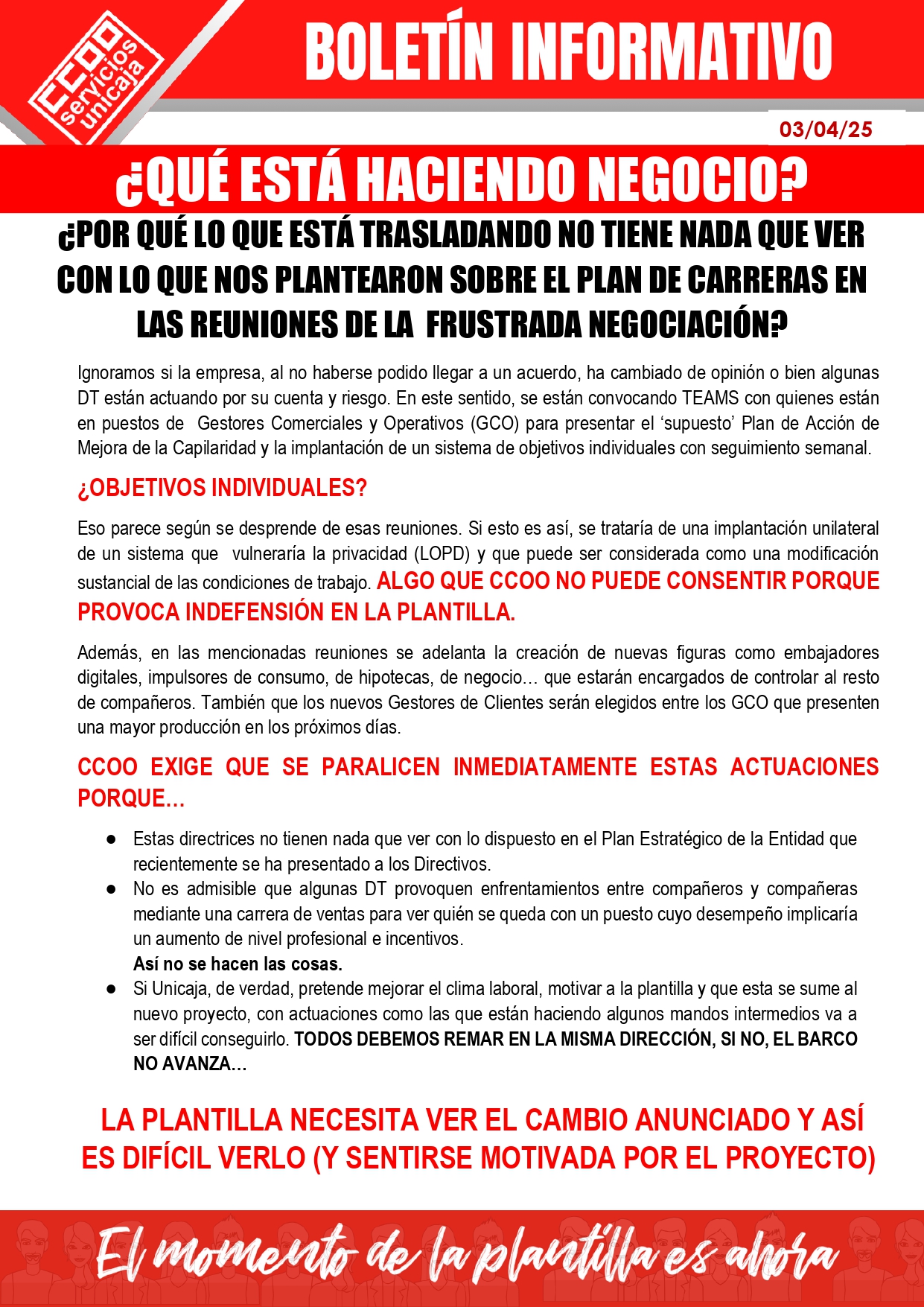 ¿POR QUÉ LO QUE ESTÁ TRASLADANDO NO TIENE NADA QUE VER CON LO QUE NOS PLANTEARON SOBRE EL PLAN DE CARRERAS EN LAS REUNIONES DE LA FRUSTRADA NEGOCIACIÓN?