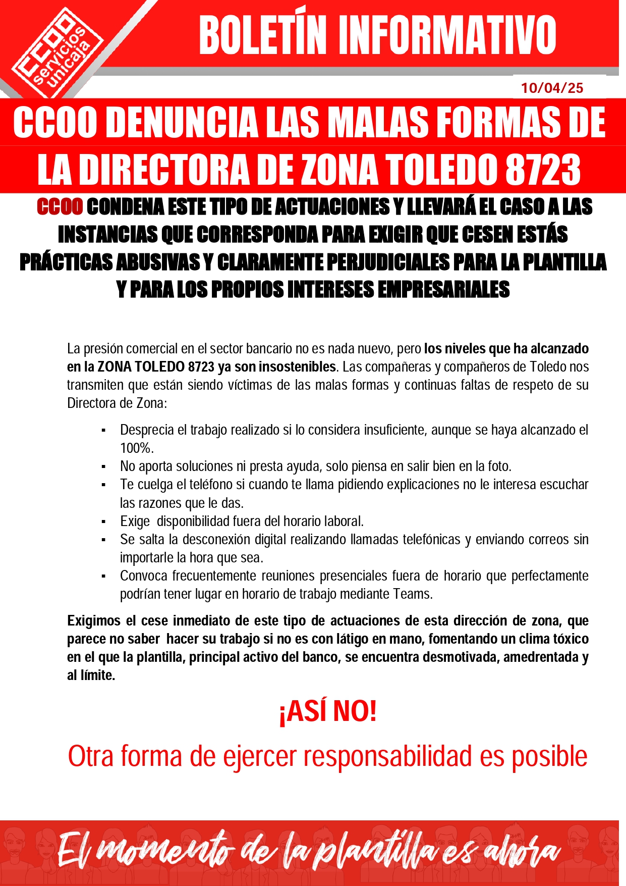CCOO DENUNCIA LAS MALAS FORMAS DE LA DIRECTORA DE ZONA TOLEDO 8723