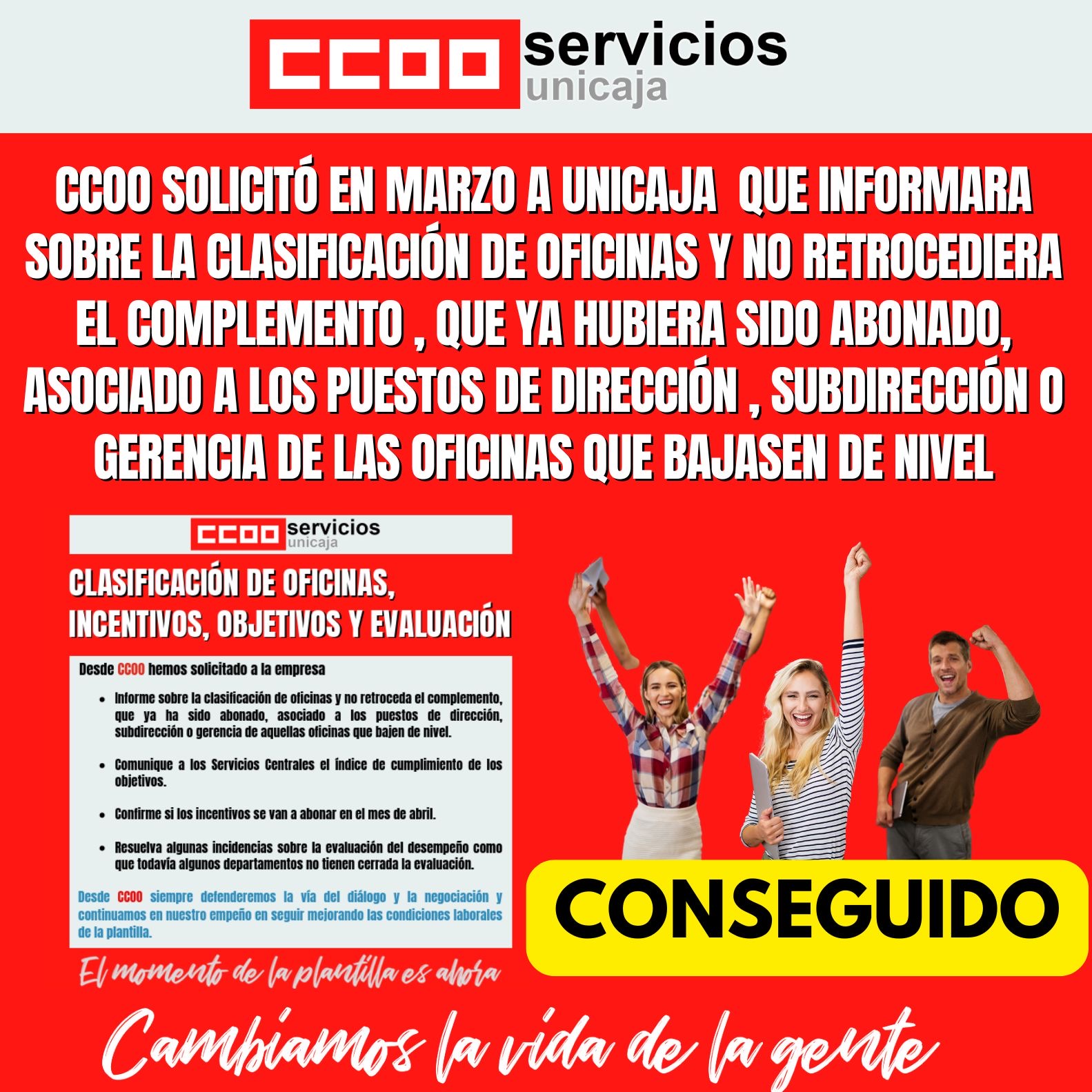 La clasificación de oficinas se publicará en breve y CCOO y UGT hemos solicitado a la empresa un año más que no se retrocedan los importes de los complementos de aquellas oficinas que hayan bajado de nivel en esta nueva clasificación y no se vean perjudicadas por la demora en la clasificación.