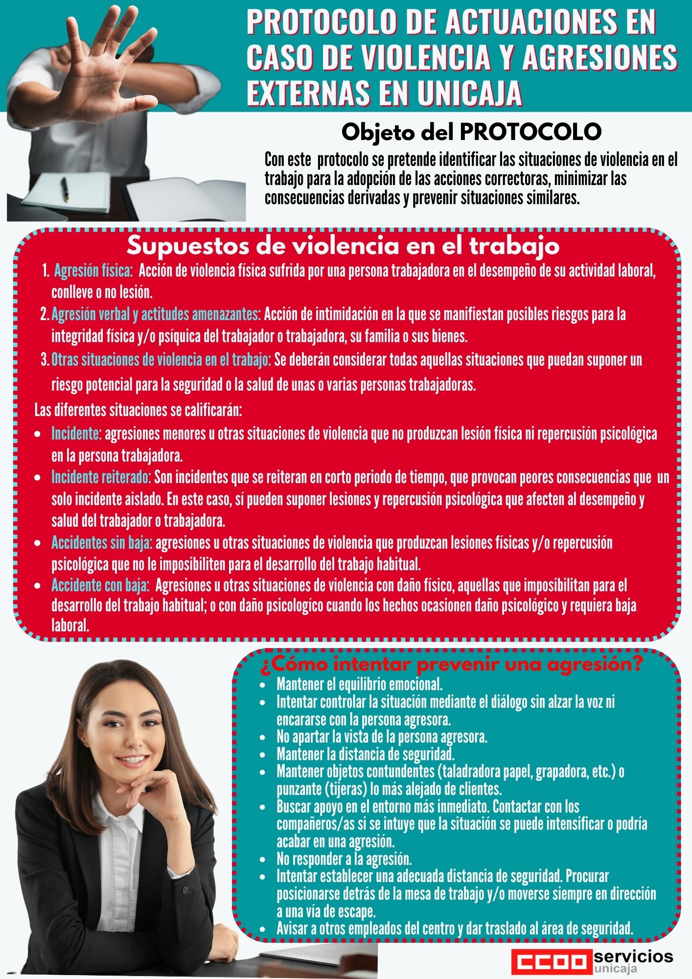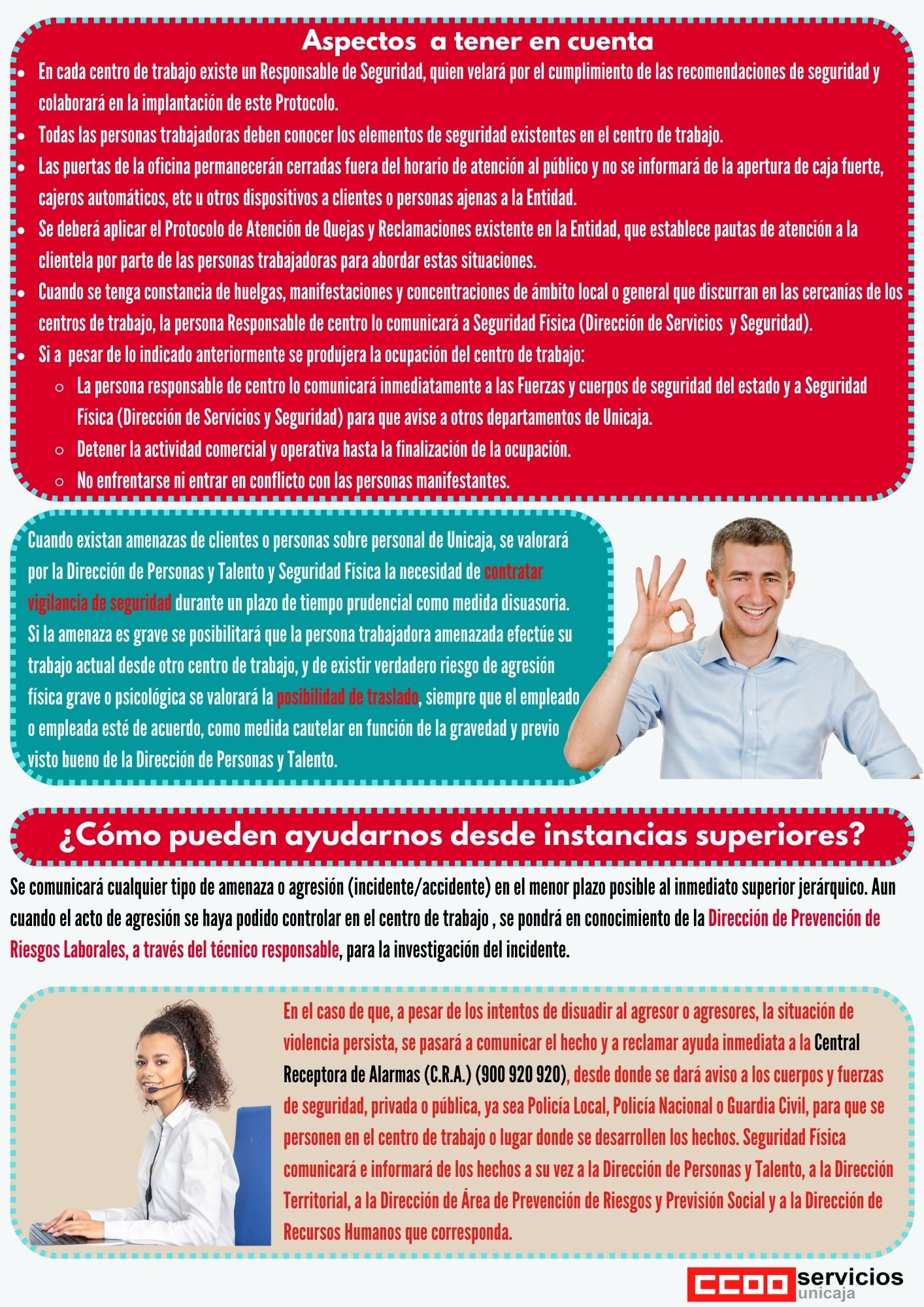Este protocolo de 2024 contiene diversas aportaciones que han realizado nuestras delegadas de prevención para mejorar todo lo posible el anterior protocolo (año 2012), ya que el ambiente de crispación de la población hace que cada vez más suframos en las oficinas ataques por parte de clientela que no está conforme con la situación económica en general y con Unicaja en particular.
