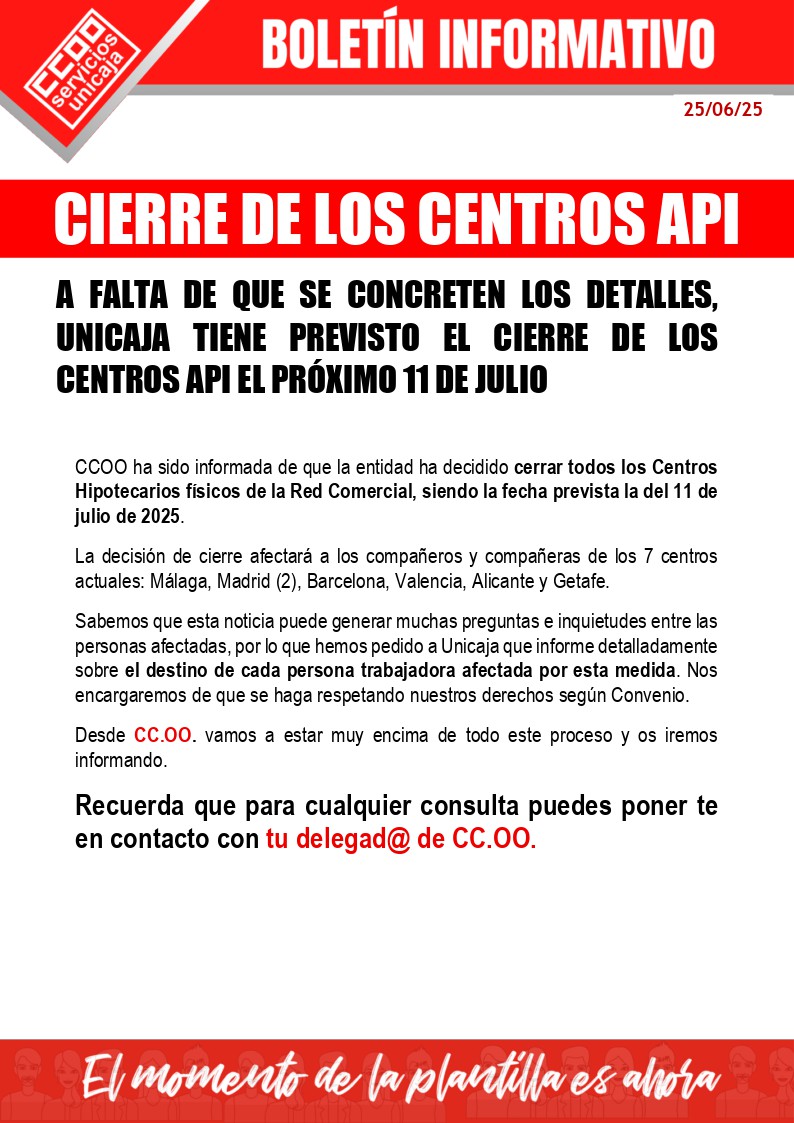 A FALTA DE QUE SE CONCRETEN LOS DETALLES, UNICAJA TIENE PREVISTO EL CIERRE DE LOS CENTROS API EL PRÓXIMO 11 DE JULIO