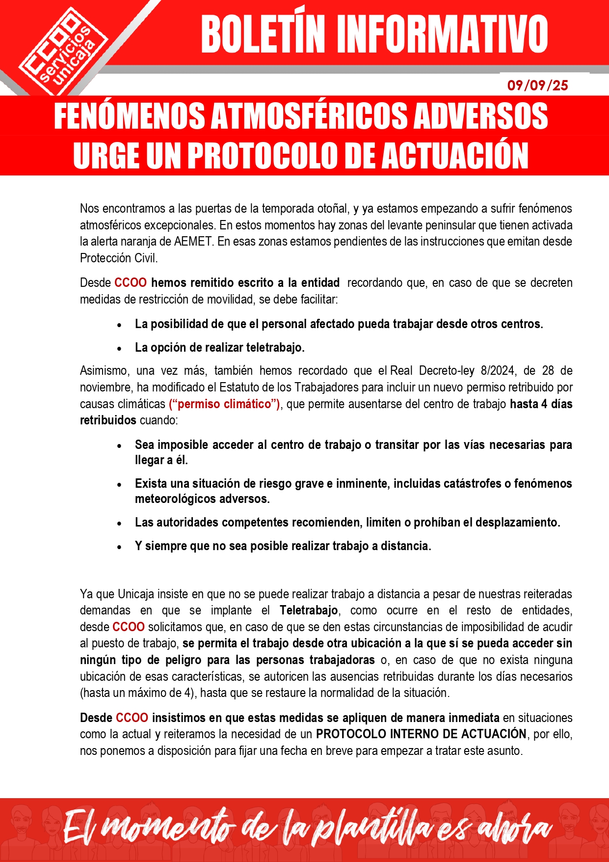 Desde CCOO hemos remitido escrito a la entidad recordando que, en caso de que se decreten medidas de restricción de movilidad, se debe facilitar: