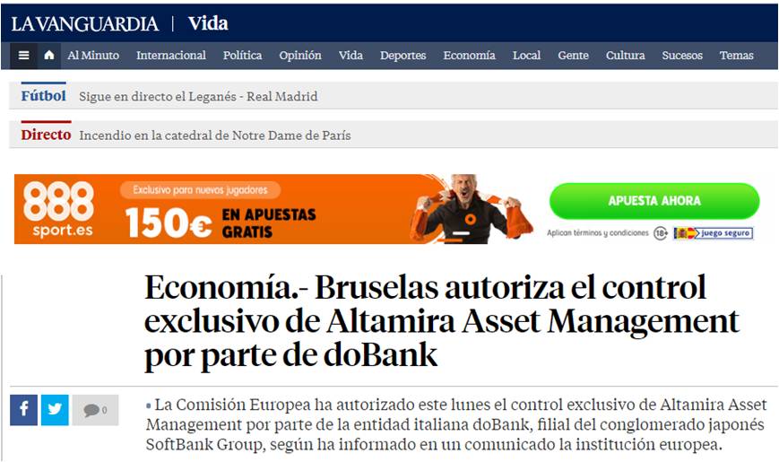 La Vanguardia – Economía.- Bruselas autoriza el control exclusivo de Altamira Asset Management por parte de doBank