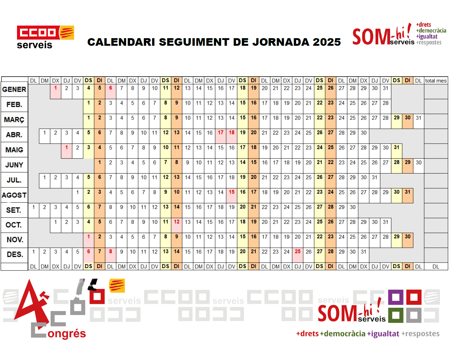 Calendari CCOO Serveis de Catalunya per fer seguiment de jornada |