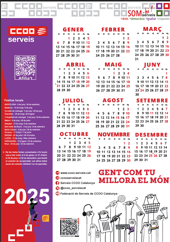 Calendari de festes laborals per a 2025, a les quals els ajuntaments poden afegir dues festes locals i materials CCOO Serveis de Catalunya en PDF.