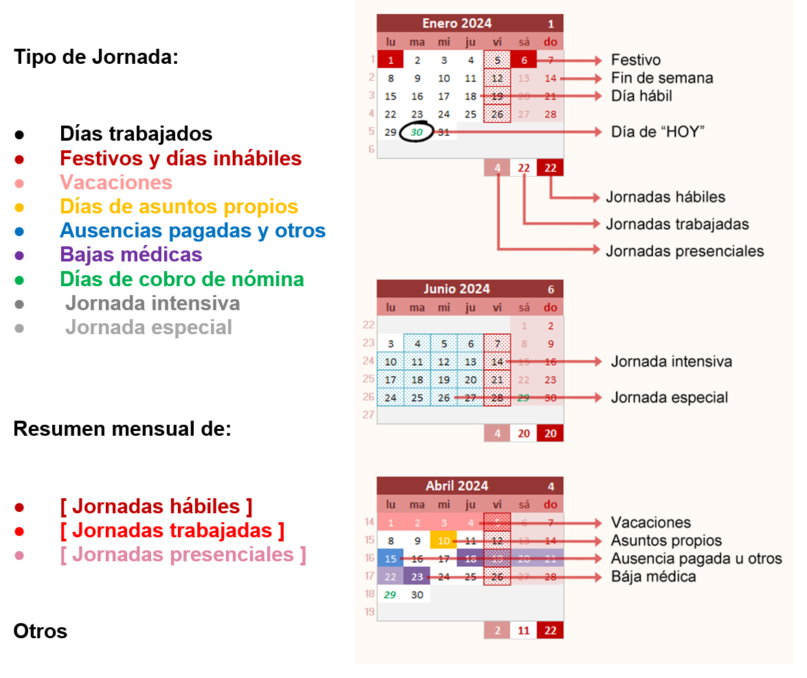 La herramienta se encargará de crear tu calendario visual, marcando todas los días y jornadas especiales, mostrándote el día de hoy y asegurándose que no haya ningún error o incongruencia en las fechas introducidas, gracias a su sistema de validación.