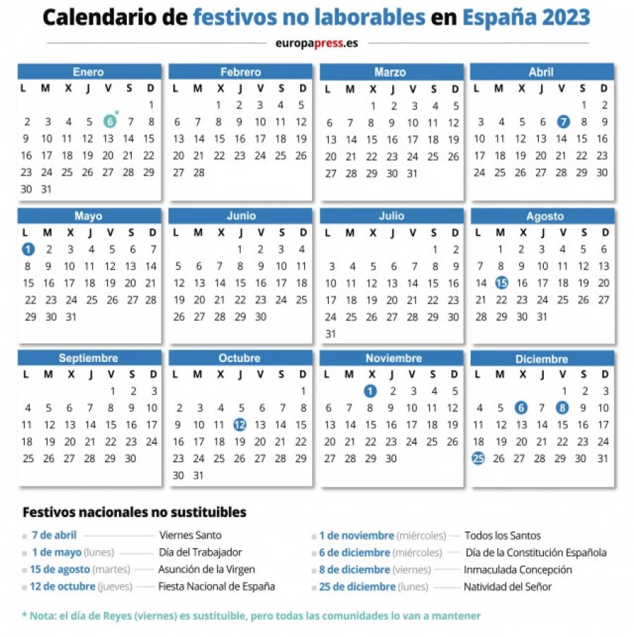 Calendario Laboral de fiestas para 2023, confeccionados con las fiestas estatales y autonómicas.