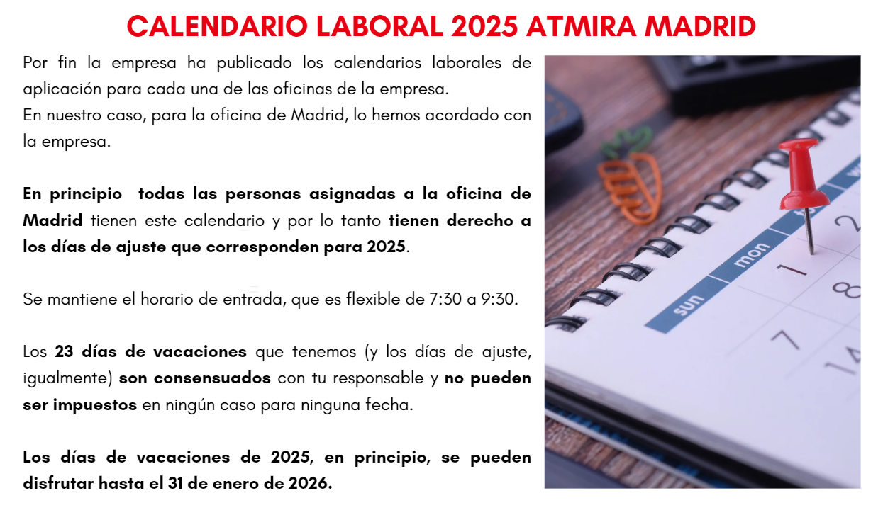En este primer comunicado del año queremos informaros del calendario laboral de atmira para 2025.