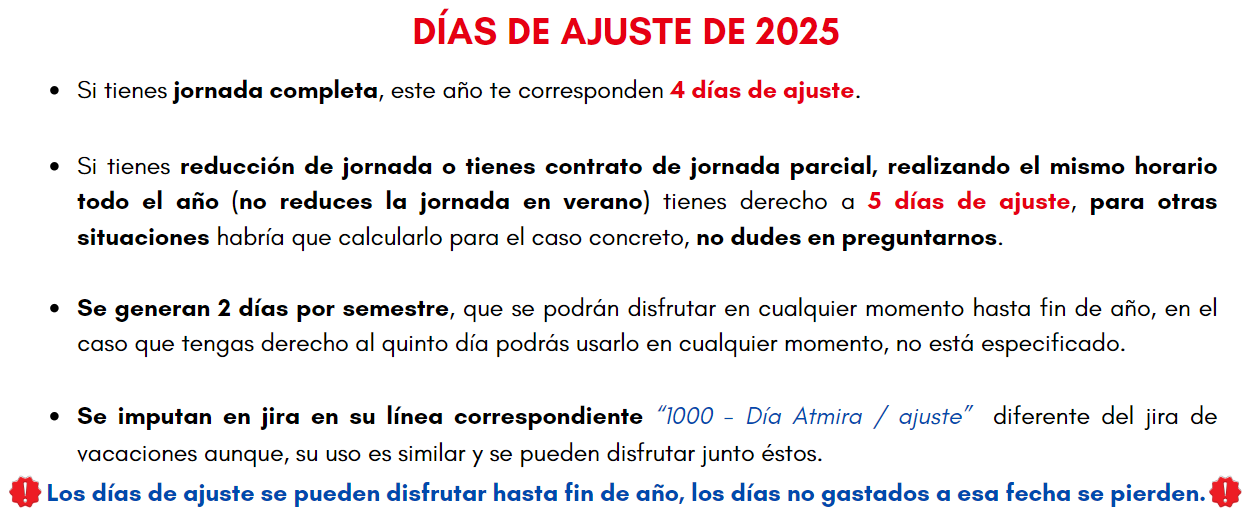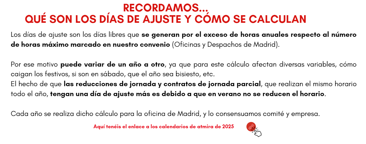 Os damos detalle de los horarios, días de vacaciones, días de ajuste (qué son y cómo se calculan cada año), etc.