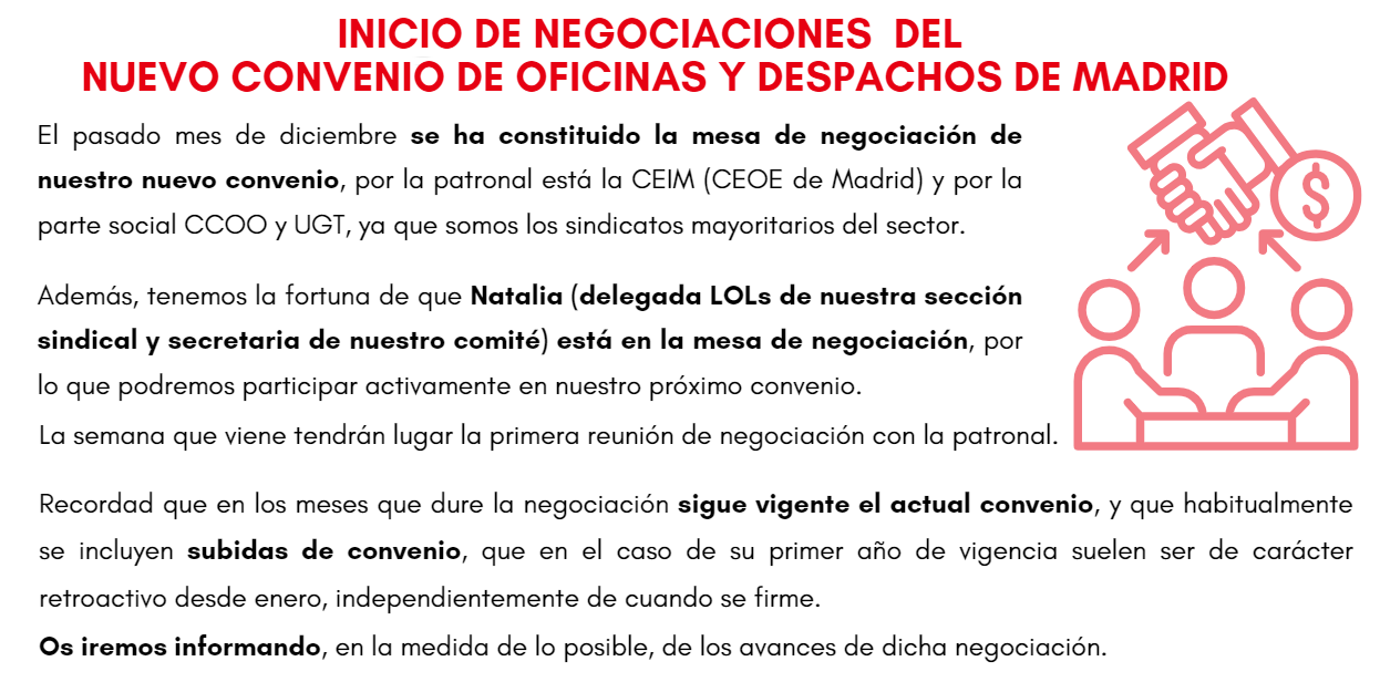 Por último, destacar que se ha iniciado la negociación para nuestro próximo convenio de Oficinas y Despachos de Madrid, en la misma tenemos presente una persona de nuestra sección sindical y del comité de atmira Madrid.