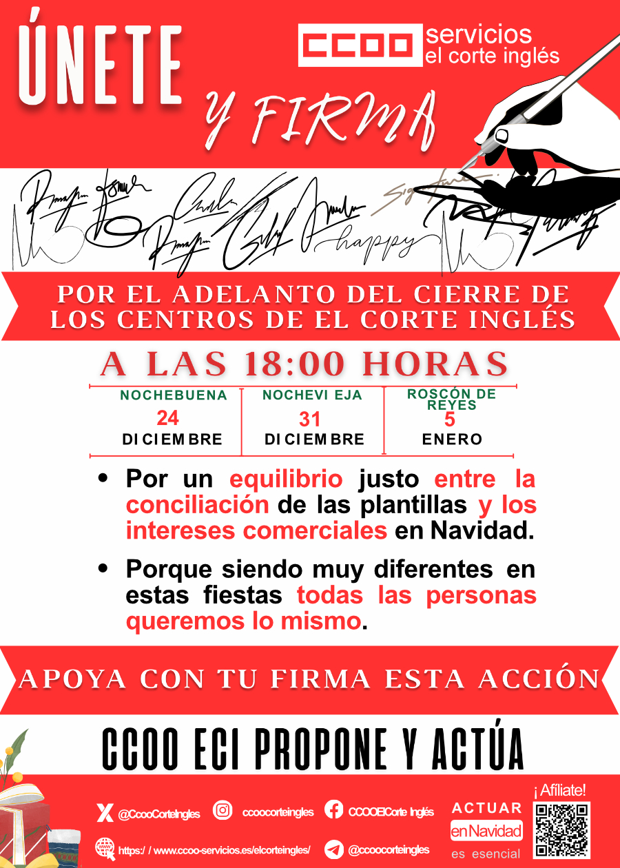 - CCOO solicita a la empresa El Corte Inglés el cierre anticipado, a las 18:00 horas, de todos los centros de trabajo los días 24 y 31 de diciembre de 2024, así como del día 5 de enero de 2025.