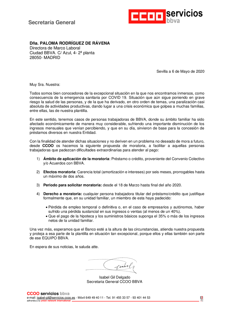 Desde CCOO hemos requerido a RRLL una carencia total de préstamos, para todas las personas trabajadoras de BBVA que han visto reducidos sus ingresos en su ámbito familiar a causa del Covid19 .