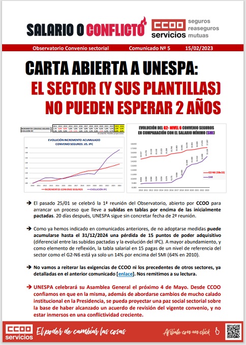 El pasado 25/01 se celebró la 1ª reunión del Observatorio, abierto por CCOO para arrancar un proceso que lleve a subidas en tablas por encima de las inicialmente pactadas. 20 días después, UNESPA sigue sin concretar fecha de 2ª reunión.