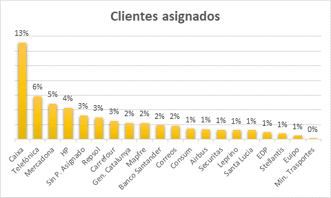 Respecto al resultado, si analizamos los que si han identificado el cliente asignado (un 55% de los encuestados), vemos que mayoritariamente las respuestas están englobadas en personas que trabajan en proyectos de: Caixa, Telefónica, Mercadona y HP.