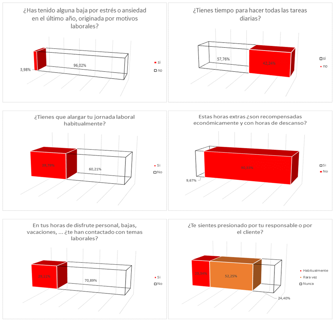 El pasado mes de mayo, os invitamos a realizar una encuesta para constatar una situación que venimos denunciando ante el continuo goteo de compañeros y compañeras que han tenido una baja médica relacionada con el trabajo. La falta de tiempo para realizar las tareas, largas jornadas laborales (no compensadas en su mayoría), son una realidad para una mayoría de los encuestados. Situaciones que poco a poco merman nuestra salud.