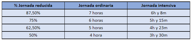 Las personas con reducción de jornada disfrutarán también de una reducción equivalente sobre su jornada ya reducida, según muestra el siguiente cuadro: