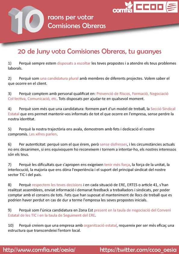A continuació presentem les 10 raons per votar a Comisiones Obreras en les pròximes eleccions sindicals en Oesia Networks Zona Est.