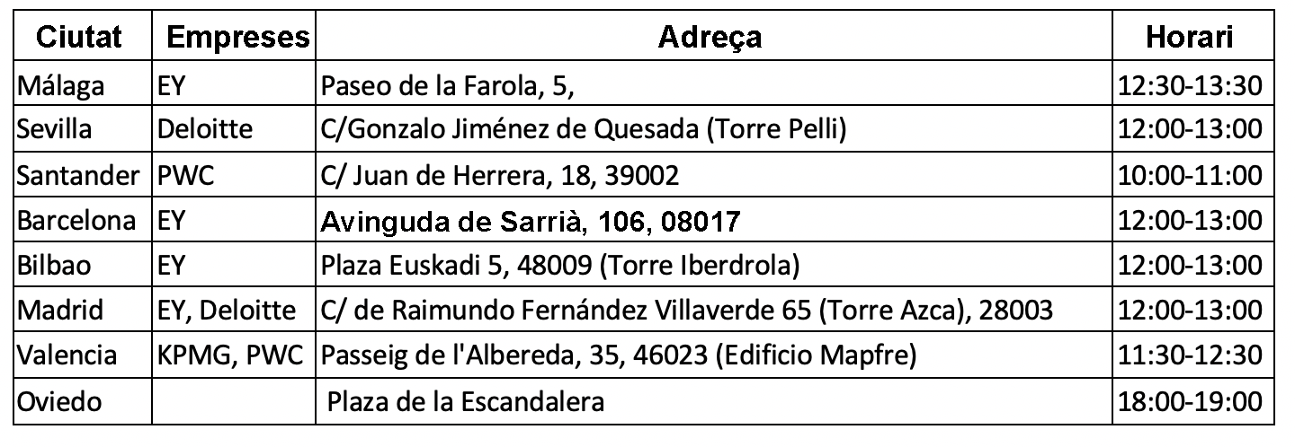En aquesta ocasió, a més de la ubicació, han optat també pel canvi d'escenari i mobilitzaran els seus representants sindicals, i tot aquell que es vulgui unir, el dia 26 de maig a les diferents seus que les quatre grans consultores (les Big Four) , PriceWaterhouseCoopers (PwC), KPMG, Deloitte i Ernst & Young (EY) tenen repartides per tot el país.