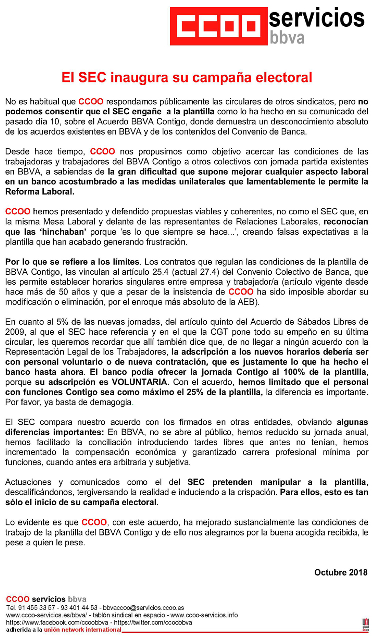 No es habitual que CCOO respondamos públicamente las circulares de otros sindicatos, pero no podemos consentir que el SEC engañe a la plantilla como lo ha hecho en su comunicado del pasado día 10, sobre el Acuerdo BBVA Contigo, donde demuestra un desconocimiento absoluto de los acuerdos existentes en BBVA y de los contenidos del Convenio de Banca. -