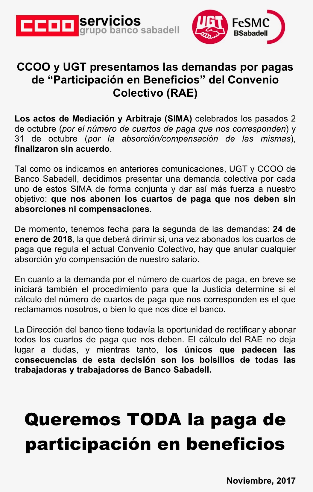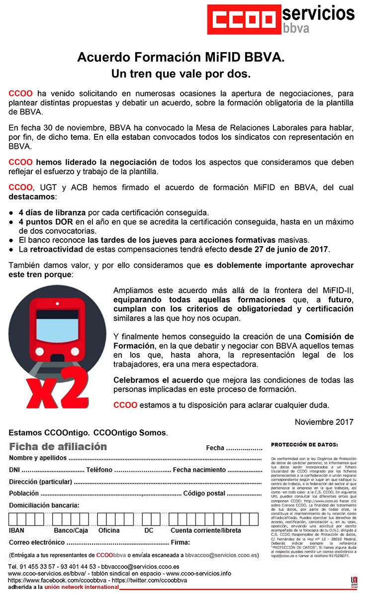 Tras el acuerdo, en sede de la Fundación Tripartita, alcanzado en solitario por CCOO el día 2 de noviembre con la Dirección, que obligaba a BMN a negociar compensaciones para las personas en formación MIFID, y ante la cita del próximo día 14 en la Inspección de Trabajo por la demanda interpuesta igualmente por CCOO, el pasado miércoles se firmaba un acuerdo para 2017 en los siguientes términos: