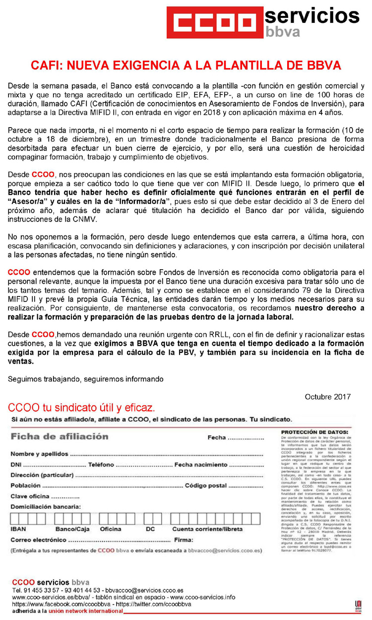 Desde la semana pasada, el Banco está convocando a la plantilla -con función en gestión comercial y mixta y que no tenga acreditado un certificado EIP, EFA, EFP-, a un curso on line de 100 horas de duración, llamado CAFI (Certificación de conocimientos en Asesoramiento de Fondos de Inversión), para adaptarse a la Directiva MIFID II, con entrada en vigor en 2018 y con aplicación máxima en 4 años.leer Comunicado de ampliación de información en pdf