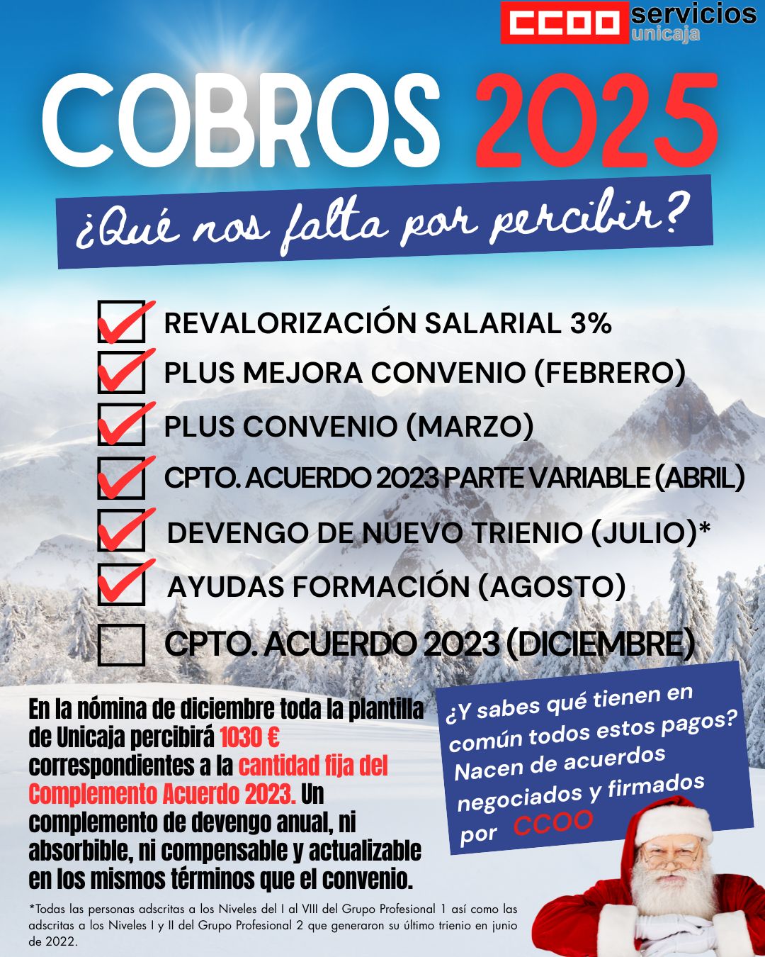 En la nómina de diciembre toda la plantilla de Unicaja percibirá 1030 € correspondientes a la cantidad fija del Complemento Acuerdo 2023. Un complemento de devengo anual, ni absorbible, ni compensable y actualizable en los mismos términos que el convenio.