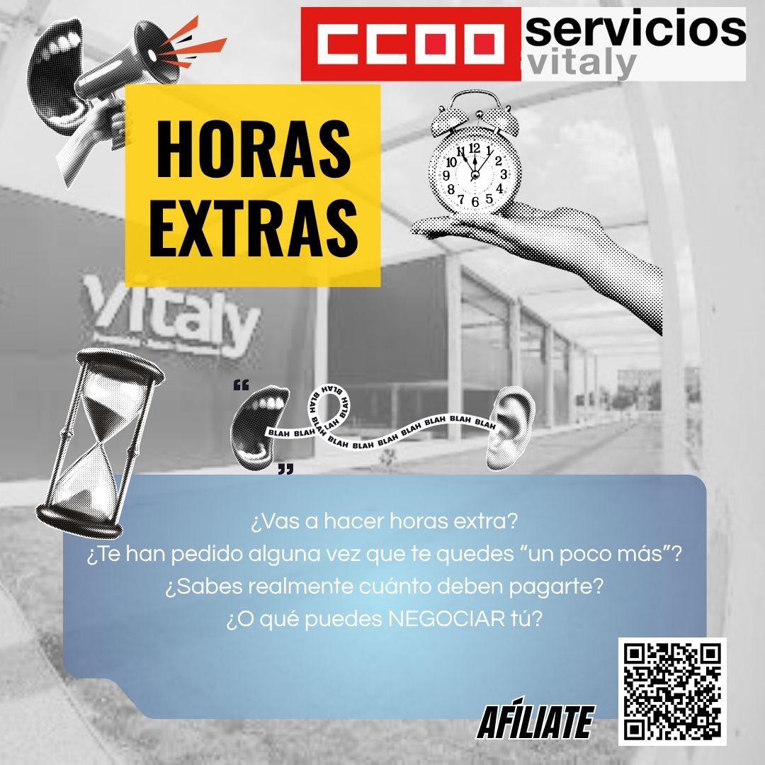 Como ya sabrás, en función de la empresa participada de la que provengas hay un mínimo de compensación por hora extraordinaria que realices. La Sección Sindical de CCOO, como aplicad@s que somos, te proponemos que no aceptes la realización de horas extraordinarias por debajo de la propuesta puesta encima de la mesa por CCOO en la Comisión de Armonización de Condiciones Laborales para toda la plantilla de Vitaly.
