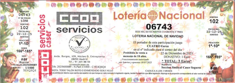 Seguimos manteniendo el importe: 5€, de los cuales se juegan 4€, siendo el euro restante donativo para la sección sindical, nuestra única fuente de financiación para las acciones que realizamos a lo largo del año como el 8 de marzo o el 25 de noviembre, entre otras.