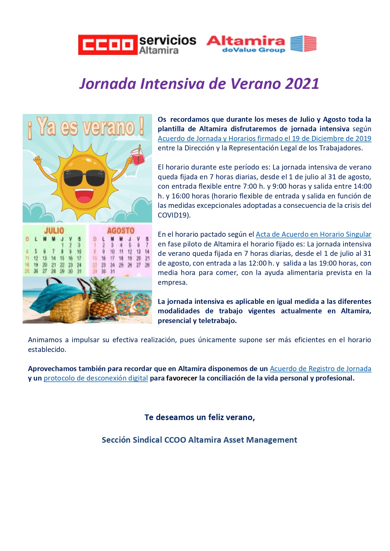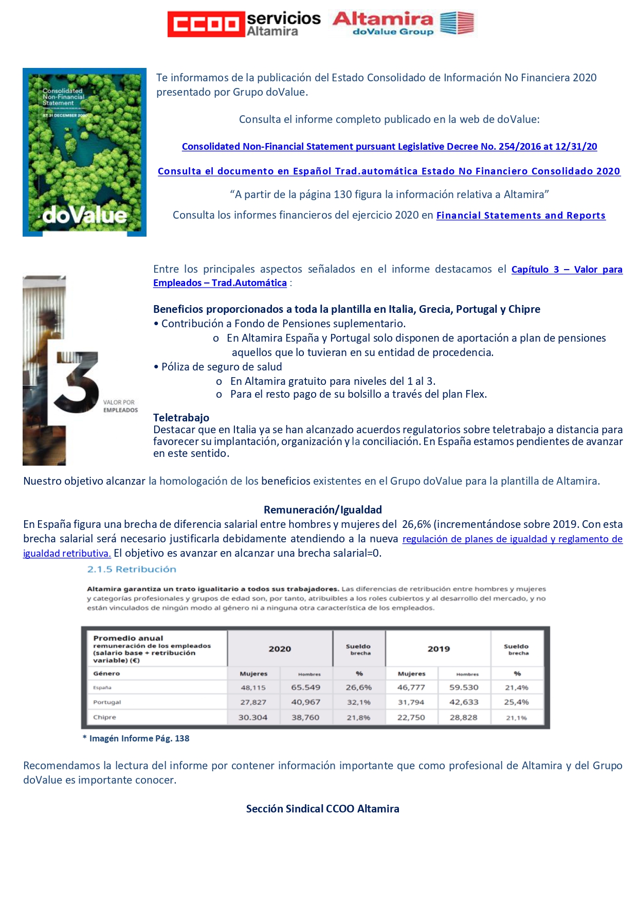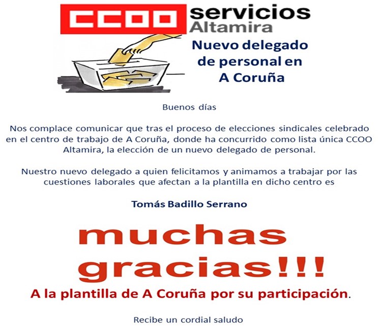 Nos complace comunicar que tras el proceso de elecciones sindicales celebrado en el centro de trabajo de A Coruña, donde ha concurrido como lista única CCOO Altamira, la elección de un nuevo delegado de personal.