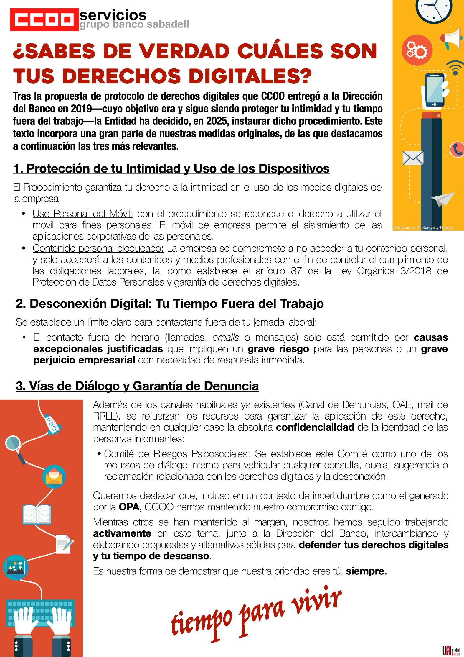 Outro piar fundamental das mobilizacións é a mellora da conciliación da vida laboral e persoal. CCOO demanda a ampliación dos descansos, a redución de horarios estendidos —especialmente para persoas maiores de 55 anos— e o respecto estrito do calendario laboral, sen cambios arbitrarios. Tamén se reclama unha maior protección da saúde física e mental.