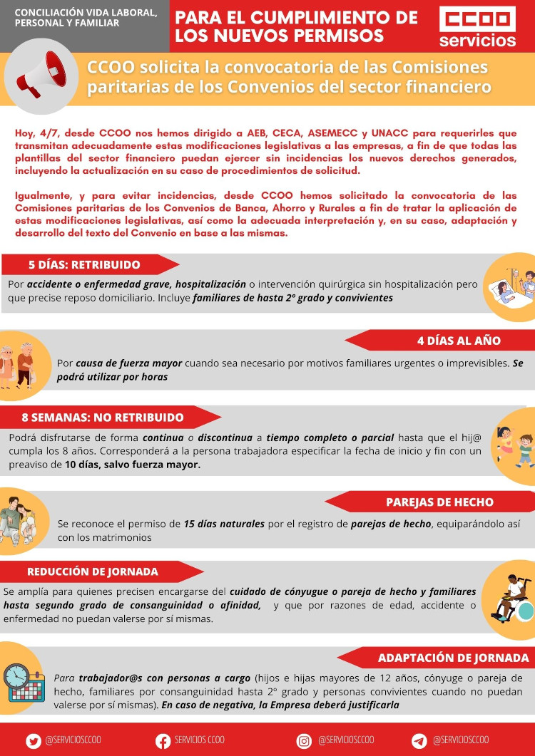 El pasado 4/7, desde CCOO nos dirigimos a AEB, CECA, ASEMECC y UNACC para requerirles que transmitan adecuadamente estas modificaciones legislativas a las empresas, a fin de que todas las plantillas del sector financiero puedan ejercer sin incidencias los nuevos derechos generados, incluyendo la actualización en su caso de procedimientos de solicitud.