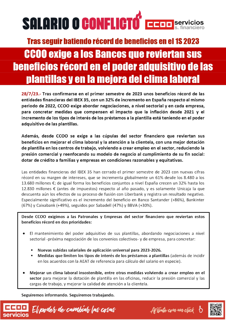 Tras confirmarse en el primer semestre de 2023 unos beneficios récord de las entidades financieras del IBEX 35, con un 32% de incremento en España respecto al mismo periodo de 2022, CCOO exige abordar negociaciones, a nivel sectorial y en cada empresa, para concretar medidas que compensen el impacto que la inflación desde 2021 y el incremento de los tipos de interés de los préstamos a la plantilla está teniendo en el poder adquisitivo de las plantillas.
