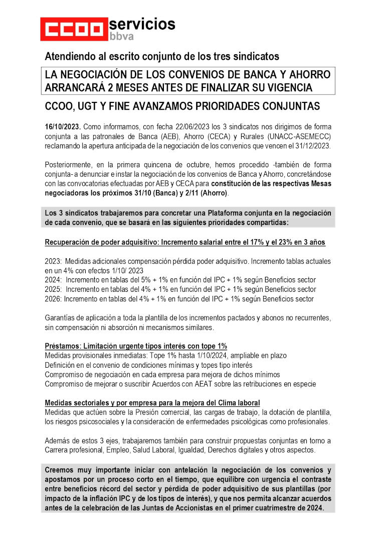 Creemos muy importante iniciar con antelación la negociación de los convenios y apostamos por un proceso corto en el tiempo, que equilibre con urgencia el contraste entre beneficios récord del sector y pérdida de poder adquisitivo de sus plantillas (por impacto de la inflación IPC y de los tipos de interés), y que nos permita alcanzar acuerdos antes de la celebración de las Juntas de Accionistas en el primer cuatrimestre de 2024.