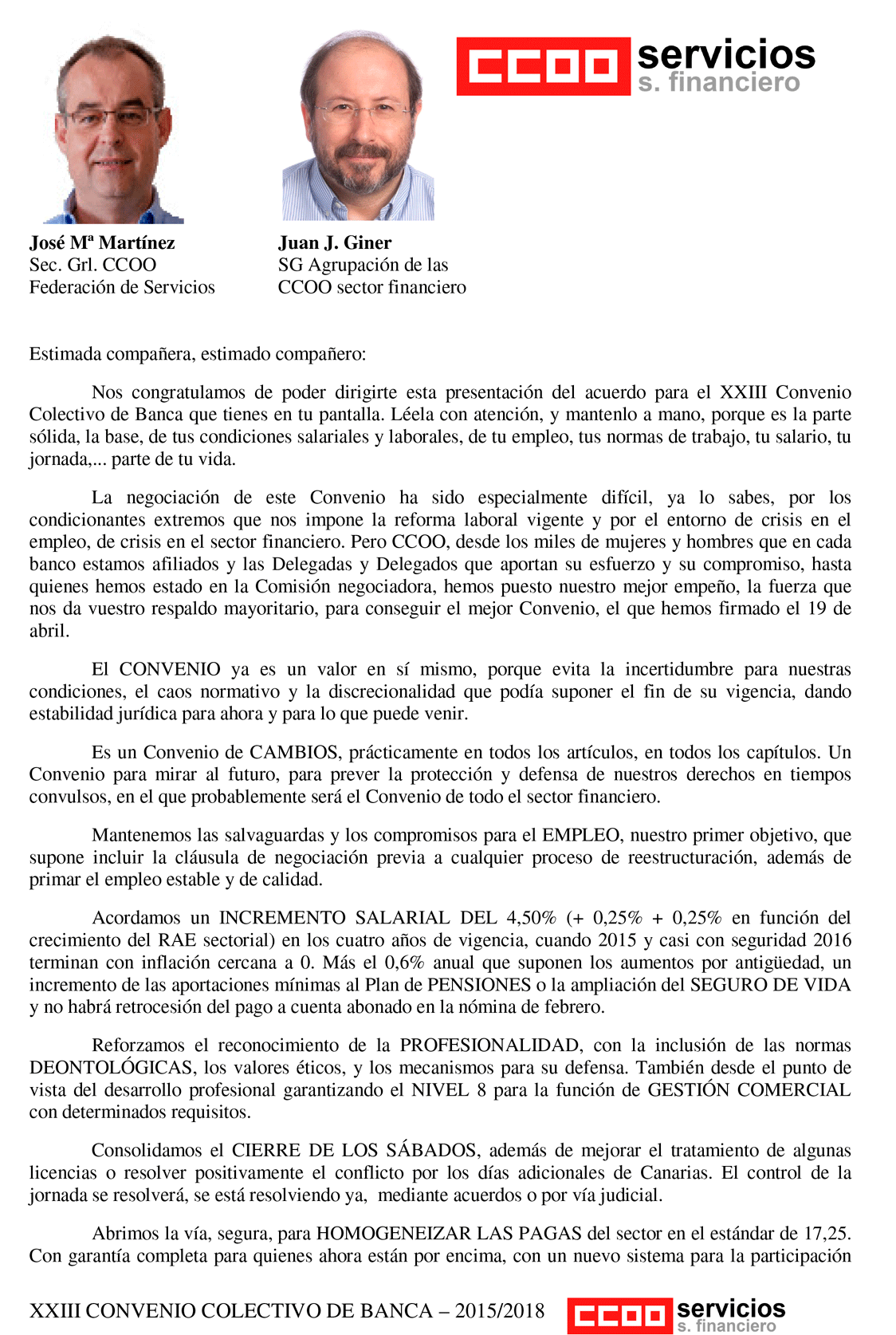 el sector financiero.Estimada compañera, estimado compañero: Nos congratulamos de poder dirigirte esta presentación del acuerdo para el XXIII Convenio Colectivo de Banca que tienes en tu pantalla. Léela con atención, y mantenlo a mano, porque es la parte sólida, la base, de tus condiciones salariales y laborales, de tu empleo, tus normas de trabajo, tu salario, tu jornada,… parte de tu vida.La negociación de este Convenio ha sido especialmente difícil, ya lo sabes, por los condicionantes extremos que nos impone la reforma laboral vigente y por el entorno de crisis en el empleo, de crisis en el sector financiero. Pero CCOO, desde los miles de mujeres y hombres que en cada banco estamos afiliados y las Delegadas y Delegados que aportan su esfuerzo y su compromiso, hasta quienes hemos estado en la Comisión negociadora, hemos puesto nuestro mejor empeño, la fuerza que nos da vuestro respaldo mayoritario, para conseguir el mejor Convenio, el que hemos firmado el 19 de abril.El CONVENIO ya es un valor en sí mismo, porque evita la incertidumbre para nuestras condiciones, el caos normativo y la discrecionalidad que podía suponer el fin de su vigencia, dando estabilidad jurídica para ahora y para lo que puede venir.Es un Convenio de CAMBIOS, prácticamente en todos los artículos, en todos los capítulos. Un Convenio para mirar al futuro, para prever la protección y defensa de nuestros derechos en tiempos convulsos, en el que probablemente será el Convenio de todo el sector financiero.Mantenemos las salvaguardas y los compromisos para el EMPLEO, nuestro primer objetivo, que supone incluir la cláusula de negociación previa a cualquier proceso de reestructuración, además de primar el empleo estable y de calidad.Acordamos un INCREMENTO SALARIAL DEL 4,50% (+ 0,25% + 0,25% en función del crecimiento del RAE sectorial) en los cuatro años de vigencia, cuando 2015 y casi con seguridad 2016 terminan con inflación cercana a 0. Más el 0,6% anual que suponen los aumentos por antigüedad, un incremento de las aportaciones mínimas al Plan de PENSIONES o la ampliación del SEGURO DE VIDA y no habrá retrocesión del pago a cuenta abonado en la nómina de febrero.Reforzamos el reconocimiento de la PROFESIONALIDAD, con la inclusión de las normas DEONTOLÓGICAS, los valores éticos, y los mecanismos para su defensa. También desde el punto de vista del desarrollo profesional garantizando el NIVEL 8 para la función de GESTIÓN COMERCIAL con determinados requisitos.Consolidamos el CIERRE DE LOS SÁBADOS, además de mejorar el tratamiento de algunas licencias o resolver positivamente el conflicto por los días adicionales de Canarias. El control de la jornada se resolverá, se está resolviendo ya, mediante acuerdos o por vía judicial.Abrimos la vía, segura, para HOMOGENEIZAR LAS PAGAS del sector en el estándar de 17,25.Con garantía completa para quienes ahora están por encima, con un nuevo sistema para la participación en beneficios de las nuevas incorporaciones y para permitir que las miles de personas en las entidades con 15,75 pagas, y sin posibilidad hasta ahora de aumentarlas, alcancen progresivamente el estándar.Dando garantías y facilidades para que el ACCESO a la profesión se haga con contrato INDEFINIDO desde el primer día. Con un salario anual que, siendo menor que el de nivel 11, es superior al del contrato en Prácticas, tanto en el primer como en el segundo año. Y acortando el periodo para el ASCENSO DE NIVEL 11 A NIVEL 10.Mejoramos las disposiciones por la IGUALDAD y la conciliación, asegurando que se abordarán en los Planes de Igualdad objetivos numéricos y temporales para la reducción de las diferencias en la promoción profesional, que es la mayor desigualdad.Incluimos un nuevo capítulo de SALUD LABORAL, para reconocer el trabajo de los Delegados de Prevención, señalando «para identificar, prevenir y corregir» los riesgos más comunes: los psicosociales, el trabajo con pantallas o el atraco.Abrimos la discusión y la negociación sobre los INCENTIVOS ligados a los objetivos poniéndolos en relación con los trienios de técnicos, con la fórmula de una Comisión de estudio y propuesta que debe dar resultados en un máximo de 18 meses.Hay más cambios, que podrás comprobar leyendo el texto completo del Convenio, y con los monográficos que sobre cada materia vamos a editar en las próximas semanas. El Convenio es un todo y por tanto tiene equilibrios, entre sus partes y entre las pretensiones de la patronal, desmesuradas al principio, y nuestras reivindicaciones. Ha habido que buscar alternativas viables, proponer cambios, buscar soluciones complejas ante problemas que así lo demandaban, innovando donde ha sido preciso, suprimiendo lo que era claramente obsoleto y manteniendo lo irrenunciable.El balance, en nuestra opinión, es muy positivo porque en CCOO trabajamos desde la convicción de que APORTANDO SOLUCIONES MEJORAMOS TUS DERECHOS.Las mujeres y hombres de CCOO estamos a tu disposición para ampliar información, resolver dudas, contestar preguntas, escuchar críticas. No dudes en dirigirte a tu Delegada o Delegado más cercano.