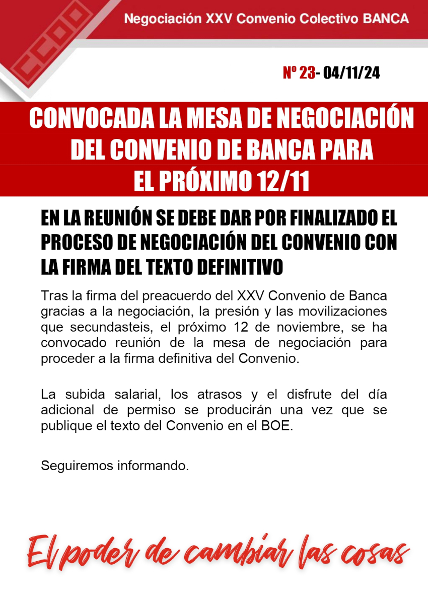 Tras el éxito de las movilizaciones impulsadas por CCOO, UGT y FINE, que propició la firma de un preacuerdo y tras haber trabajado durante largo tiempo en su redacción para garantizar el cumplimiento de lo acordado, hoy hemos firmado el XXV Convenio de Banca 2024-2026.