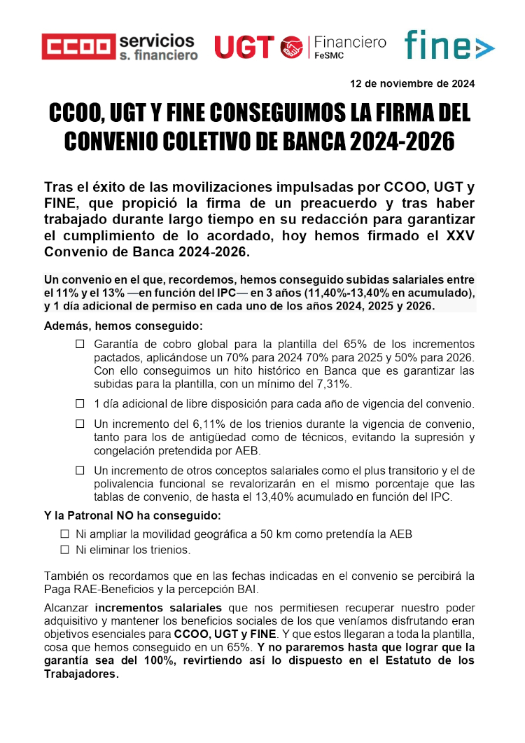 Comunicado Conjunto CCOO-UGT-FINE : Firmado el XXV Convenio de Banca