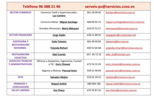 De forma complementaria, a nivel de CCOO Servicios te ofrecemos dos correos a los que puedes dirigirte si necesitas una atención más específica en nuestros sectores y empresas (Comercio, Hostelería, Sector Financiero, Servicios Técnicos y Admtivos.): serveis-pv@servicios.ccoo.esservicios@servicios.ccoo.es