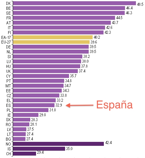 Ingresos fiscales por países en porcentaje del PIB nacional en 2010. Fuente: Eurostat.