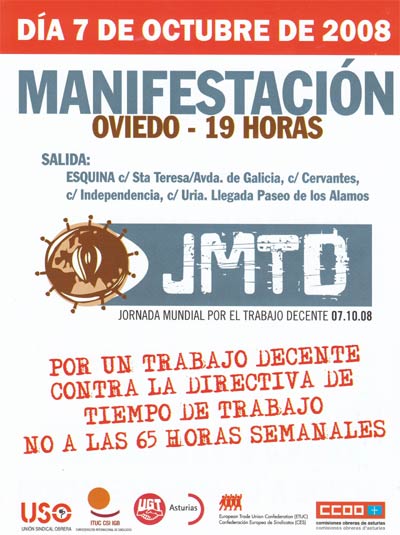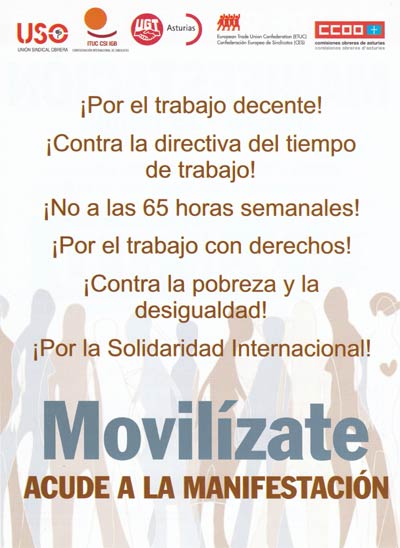 CCOO y UGT ha publicado un Manifiesto en el que aseguran que “los beneficios de la globalización se han distribuido de forma extraordinariamente desigual entre países y grupos sociales. Al mismo tiempo, se ha incrementado la brecha que separa a los más pobres de los más ricos. Las desigualdades se han acentuado entre los países y también en su interior”. El manifiesto denuncia entre otras cosas que la mitad de la fuerza laboral mundial gana menos de 2 dólares diarios, más de 12 millones de personas trabajan en condiciones de esclavitud; 200 millones de niños y  niñas menores de 15 años trabajan en lugar de ir a la escuela; más de 2 millones de personas mueren a causa de accidentes y enfermedades laborales cada año y los derechos laborales y sindicales fundamentales no son respetados en muchos países del mundo.