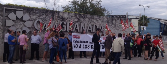 Comfia-CCOO BMN-Andalucía se concentró ayer por la tarde a la entrada de la última Asamblea General de Consejeros/as de CajaGRANADA en 122 años de historia junto con un grupo de trabajadores y trabajadoras de Granada capital, Área Metropolitana y SSCC, para hacer patente la repulsa e indignación que han provocado entre la plantilla los 6 despidos producidos en las últimas 24 h. en la capital.