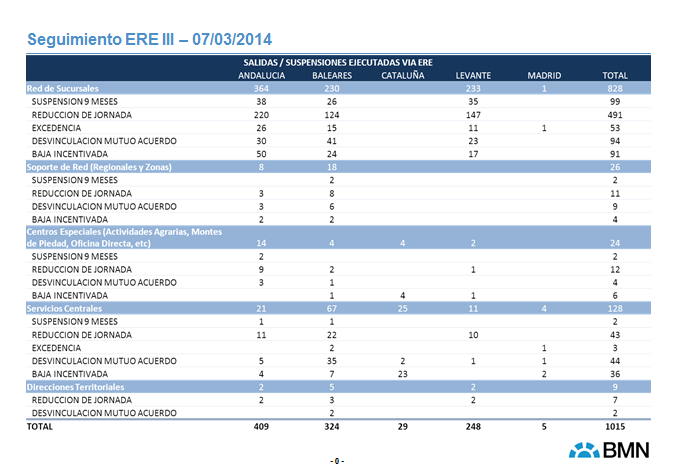 Con igual firmeza mostramos total predisposición para llegar a un acuerdo, si la actual legislación laboral no nos deja otras salida (aunque no haya razones económicas aparentes) y siempre que las salidas sean voluntarias, ajustando la plantilla a la actual estructura de negocio de BMN.