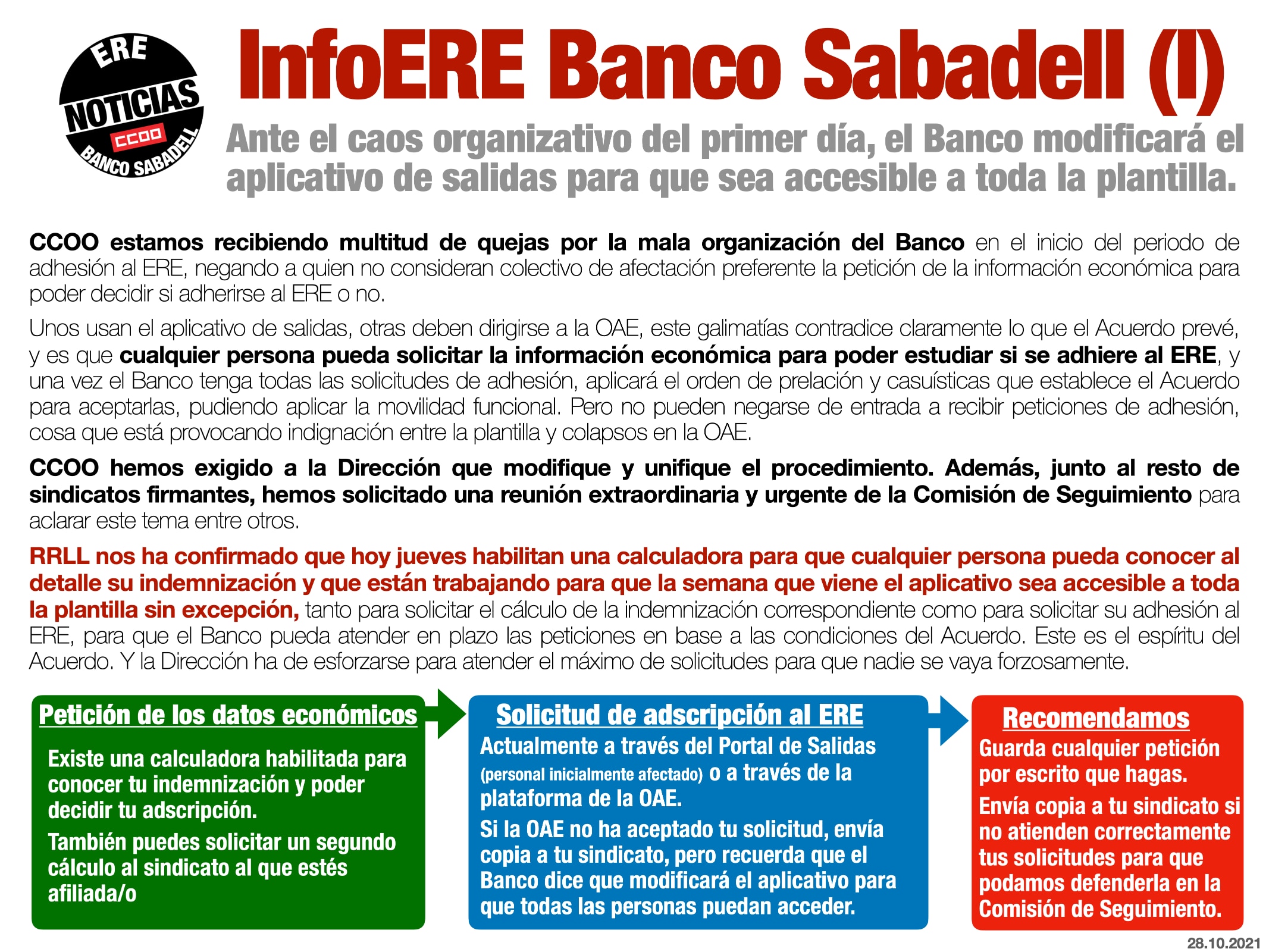 Sobre la movilidad anunciada por la empresa, CCOO está totalmente en contra de ampliar el límite de movilidad del convenio al 90 kilómetros y defiende que cualquier proceso de movilidad que se pacte sea voluntario, bien remunerado y con posibilidad de vuelta. Hay soluciones alternativas a la movilidad como la recolocación en las oficinas del entorno, el teletrabajo, las excedencias voluntarias incentivadas con garantía de retorno…