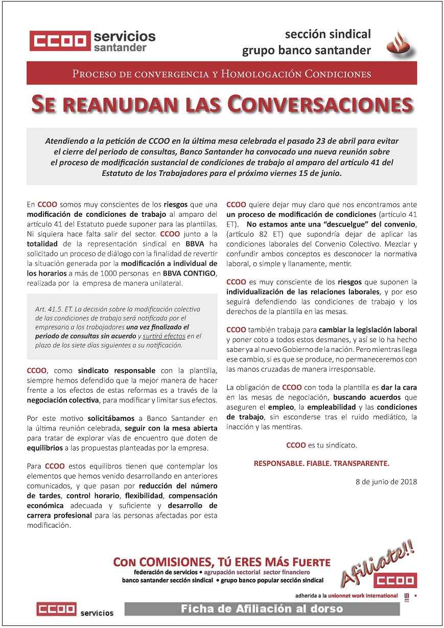 Atendiendo a la petición de CCOO en la última mesa celebrada el pasado 23 de abril para evitar el cierre del periodo de consultas, Banco Santander ha convocado una nueva reunión sobre el proceso de modificación sustancial de condiciones de trabajo al amparo del artículo 41 del Estatuto de los Trabajadores para el próximo viernes 15 de junio. -