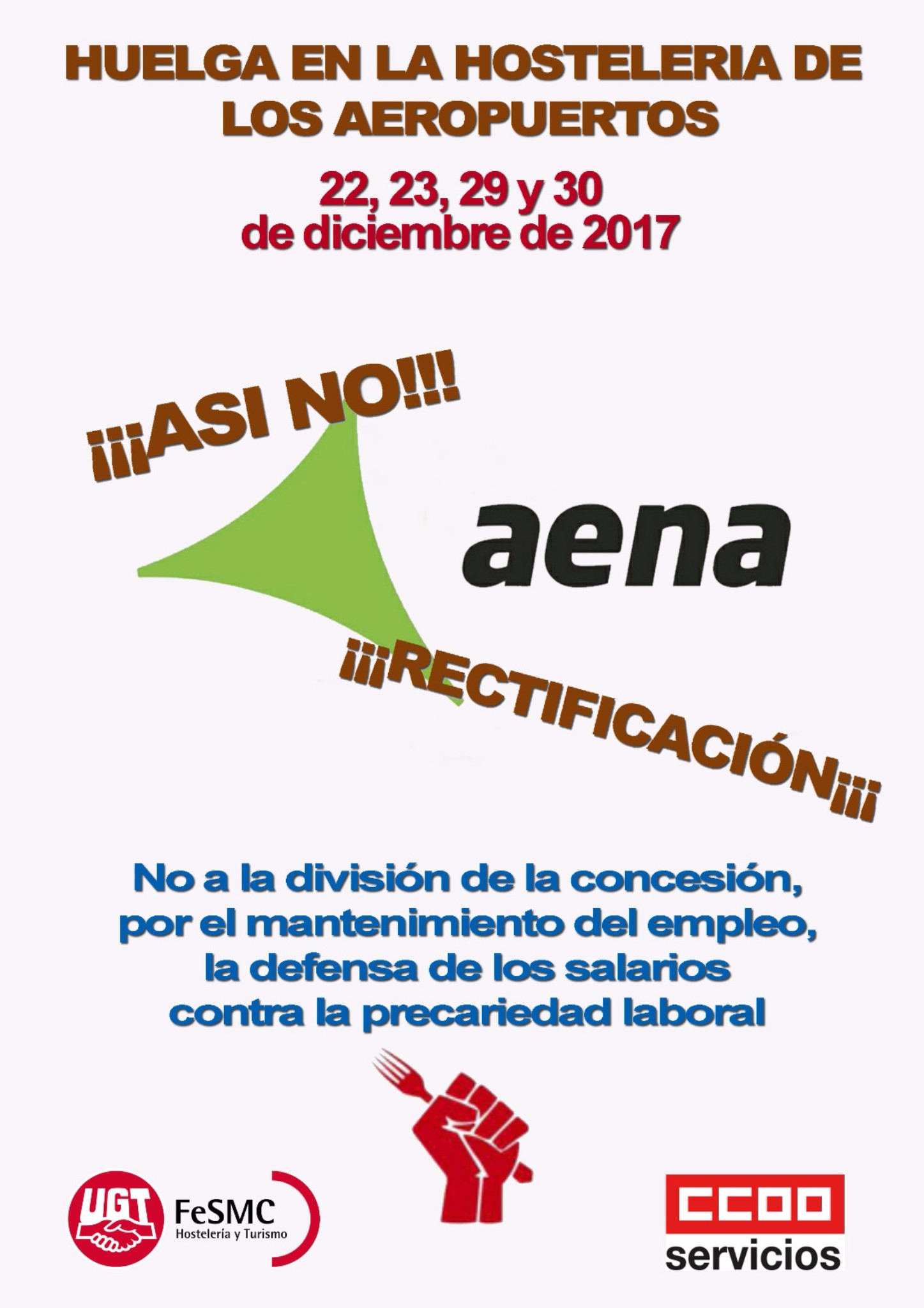 En apoyo de las trabajadoras y trabajadores de la Hostelería de los Aeropuertos CCOO y UGT junto Los trabajadores y trabajadoras aprueban las movilizaciones y paros para los días 22, 23 ,29 y 30 de Diciembre en los principales aeropuertos españoles. El motivo es que AENA ha sacado a licitación pública espacio de hostelería, aumentando el números de lotes, por lo tanto divide lo existentes y los trabajadores y trabajadoras. Todo con el objetivo del afán recaudatorio de AENA, lo que conocemos como «concursos temerarios» está situación va a poner en peligro los puestos de trabajo, y va a traer probreza salarial y precariedad. En definitiva un empeoramiento de las condiciones sociales y económicas. Todo esto se está llevando con la complicidad de las empresas. !!! No a la Division!!