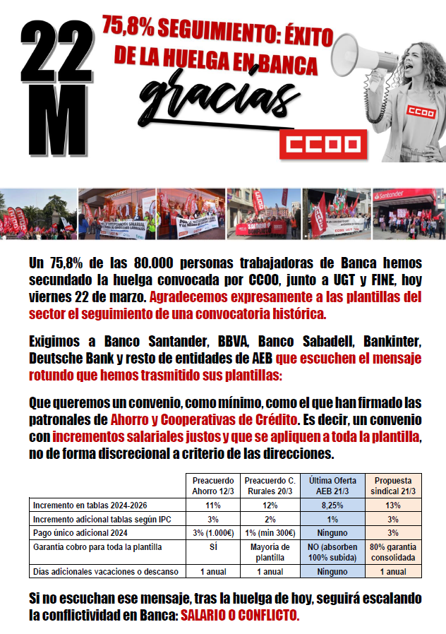 - Un 75,8% de las 80.000 personas trabajadoras de Banca han secundado la huelga convocada por CCOO, UGT y FINE hoy viernes 22 de marzo. Los 3 sindicatos convocantes agradecemos expresamente a las plantillas del sector el seguimiento de una convocatoria histórica.