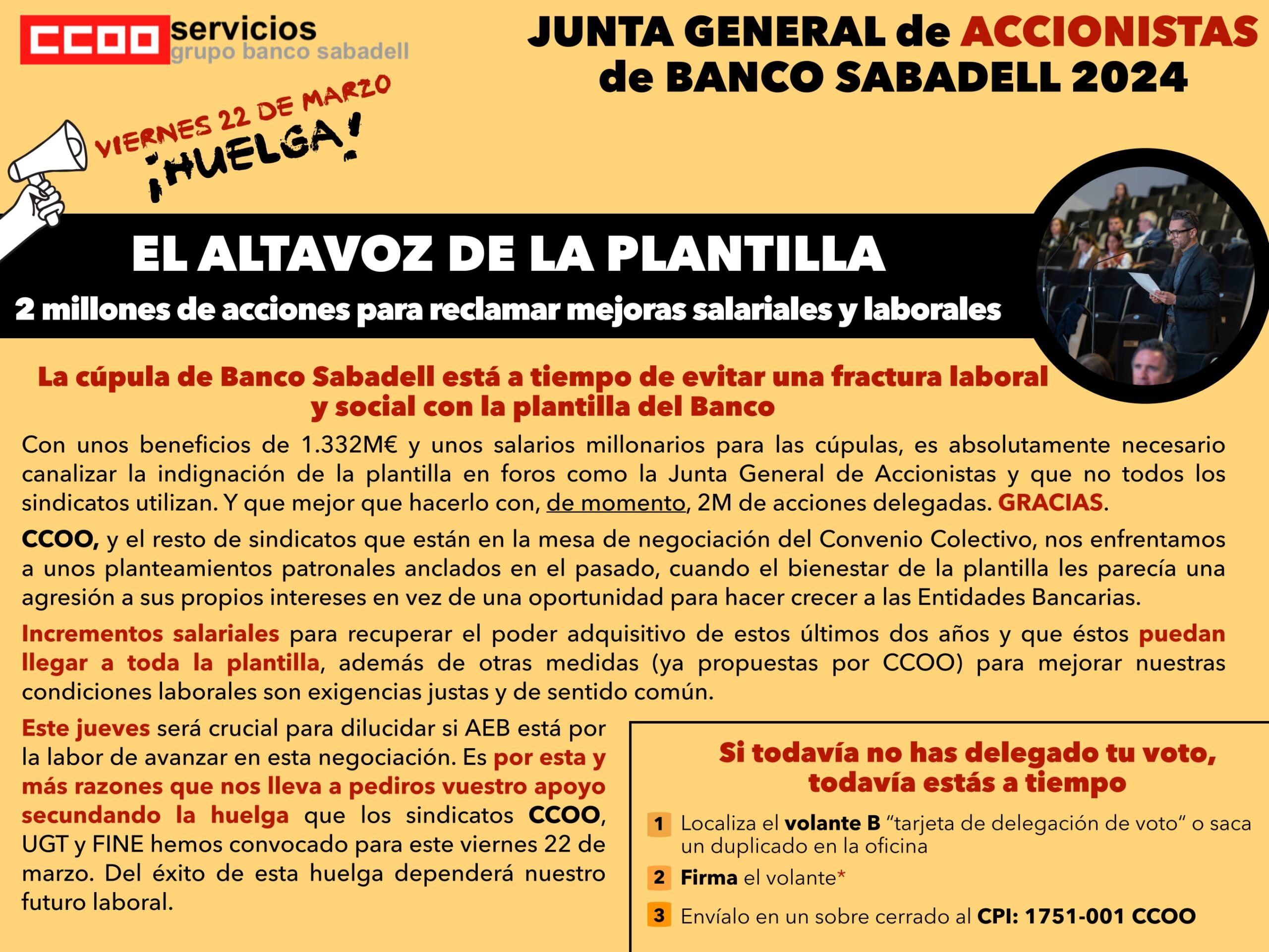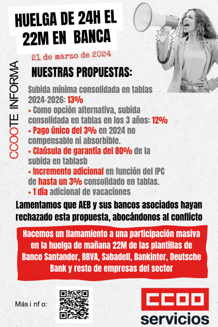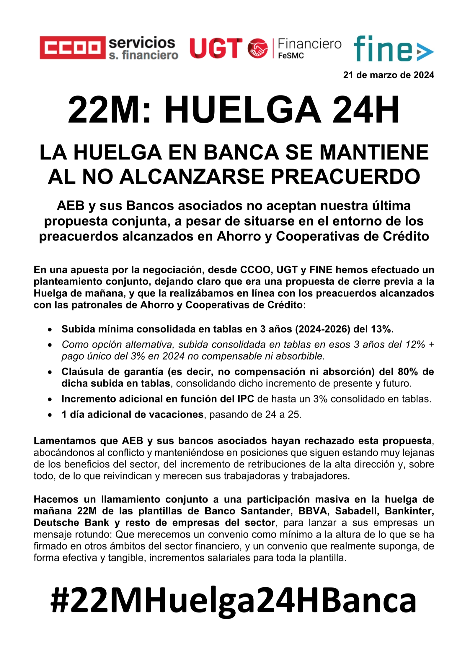 Desde CCOO, UGT y FINE hacemos un llamamiento conjunto a una participación masiva en la huelga de mañana 22M de las plantillas de Banco Santander, BBVA, Sabadell, Bankinter, Deutsche Bank y resto del sector, para lanzar a sus empresas un mensaje rotundo: Que merecemos un convenio como mínimo a la altura de lo que se ha firmado en otros ámbitos del sector financiero, y un convenio que realmente suponga, de forma efectiva y tangible, incrementos salariales para toda la plantilla.