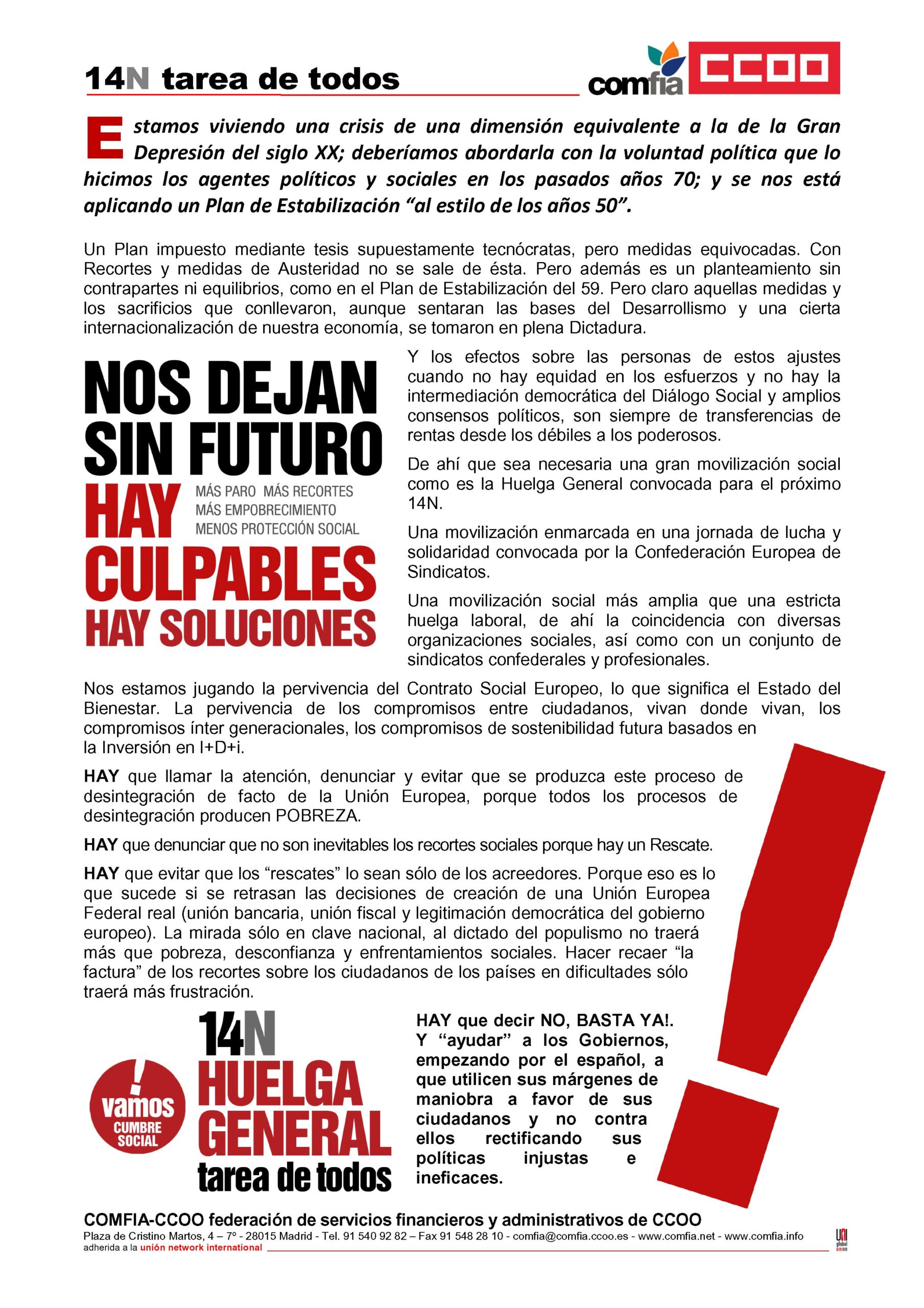 Te facilitamos el Comunicado, que ha editado COMFIA-CCOO, ante la Convocatoria de la jornada de Huelga General del 14 de noviembre.