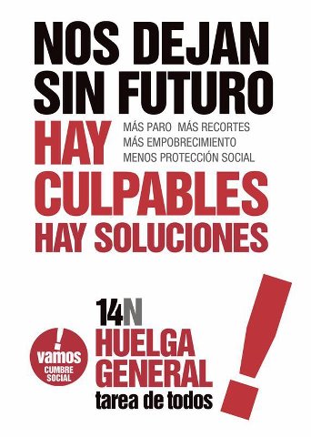 La Cumbre Social respalda por unanimidad la huelga general que habían decidido convocar CCOO y UGT para frenar el daño que las políticas de austeridad están causando. «Se ha incrementado el paro – «en España se acerca a los 6 millonesde personas», subrayó Toxo-, se ha deteriorado la educación y la sanidad pública, … todo lo que genera empleo y desarrollo se ha visto afectado por los recortes», aseveró el secretario general de CCOO en la rueda de prensa en la que anunció la decisión de la Cumbre, y en la que también replicó al presidente del Gobierno sobre los perjuicios que podría causar la huelga a la economía y la imagen del país: «Ninguna huelga por larga que fuera hará tanto daño a la economía como la política del Gobierno, que está destruyendo cientos de miles de empleos».