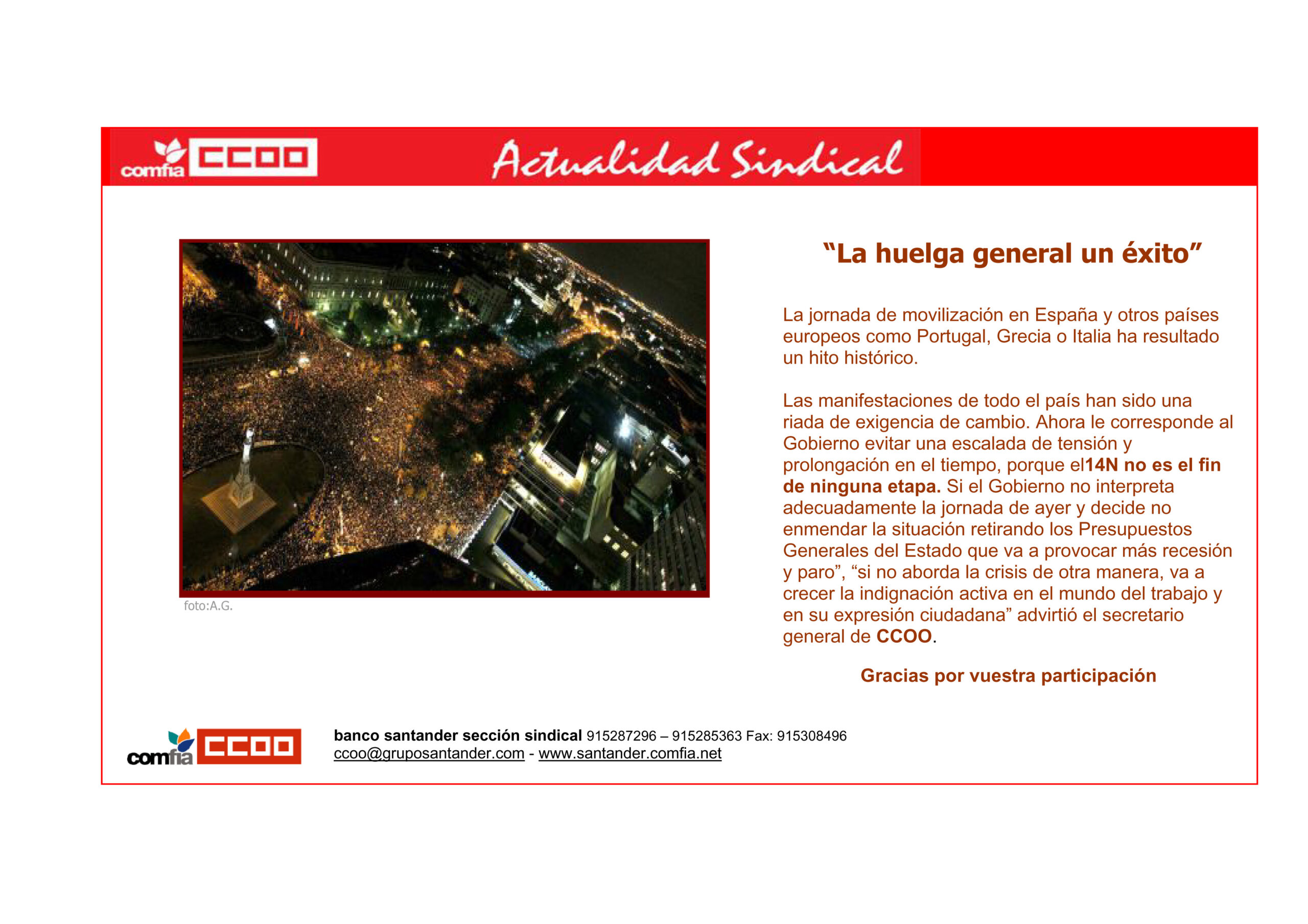 «Desde Argentina, enviamos nuestra solidaridad con la lucha de los trabajadores de vuestro país. Esperamos que pronto se reviertan las políticas que perjudican a España, a los trabajadores y a los bancarios en particular. Eduardo Negro Comisión Gremial Santander